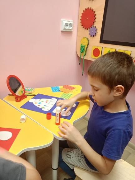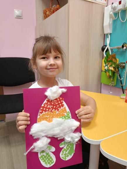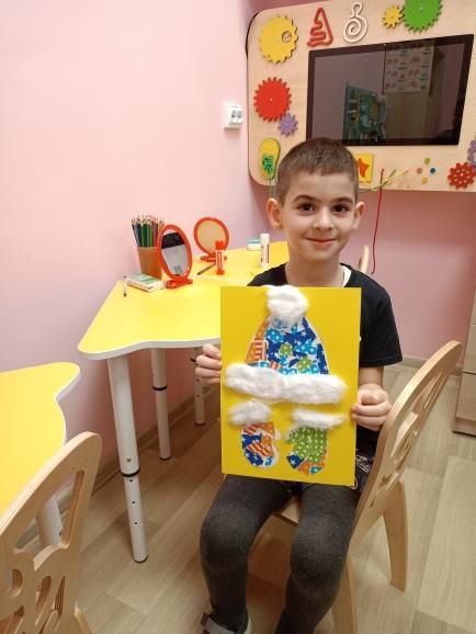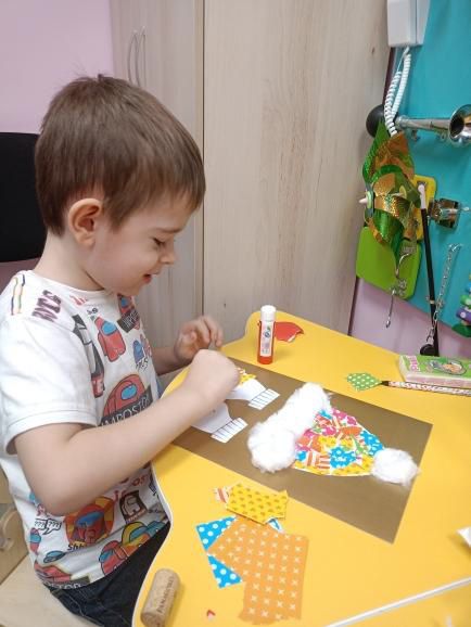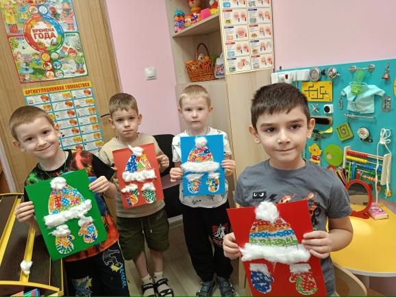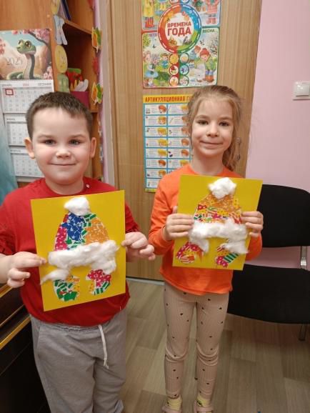 С целью развития творческих способностей и развития мелкой моторики рук, ребята выполнили аппликацию «Шапочка и варежки» с цветной бумаги и ваты с использованием методом рванки.
