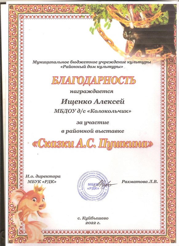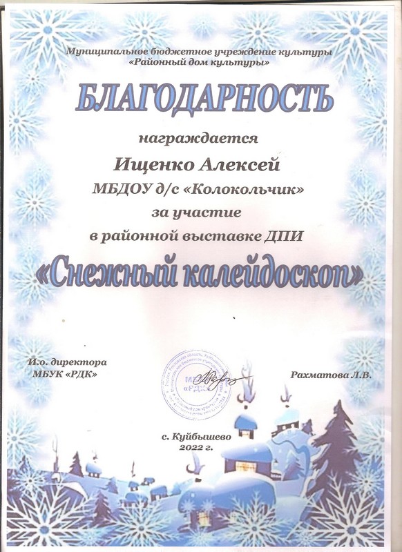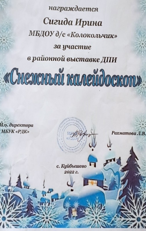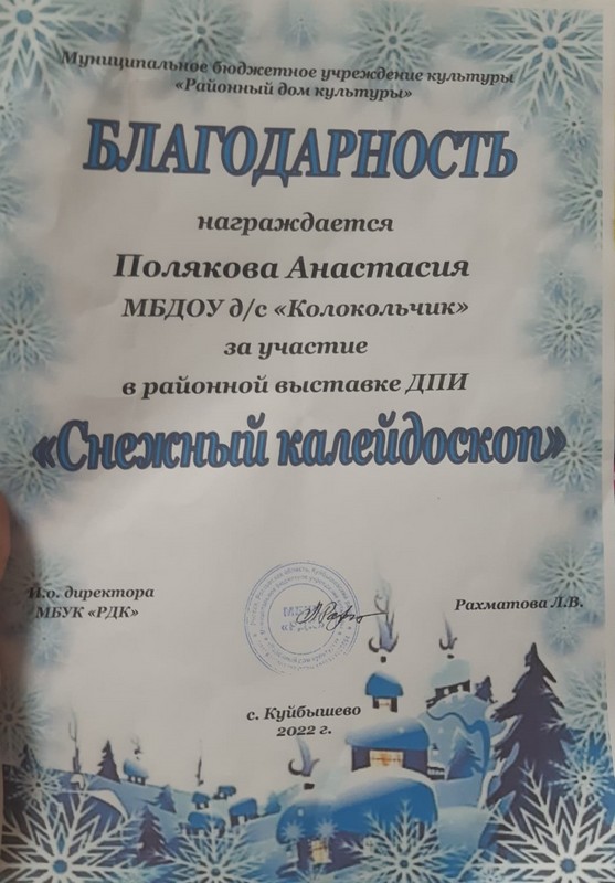 В конце 2021 года дети разновозрастной группы №1 вместе с родителями приняли активное участие в выставке ДПИ «Снежный калейдоскоп» и конкурсе рисунков «Сказки А.С.Пушкина». Получили благодарности и диплом.