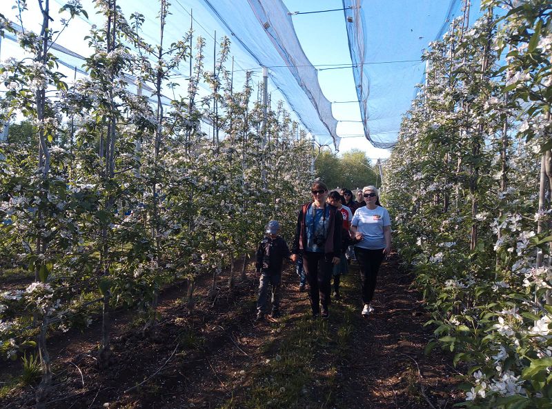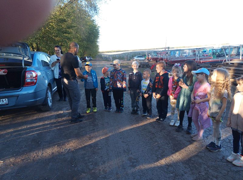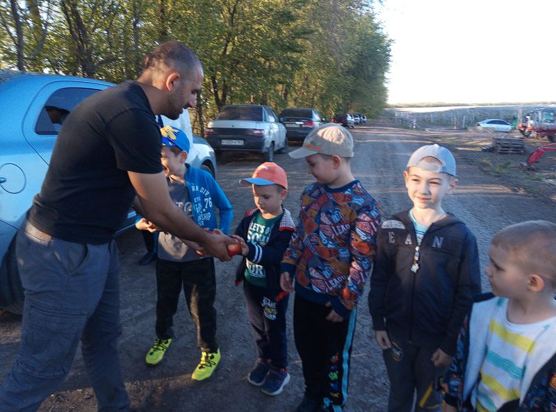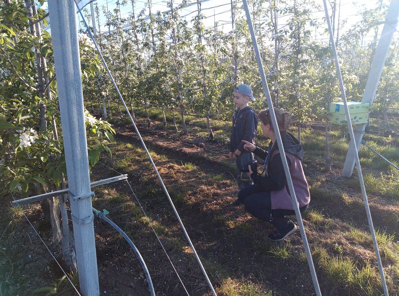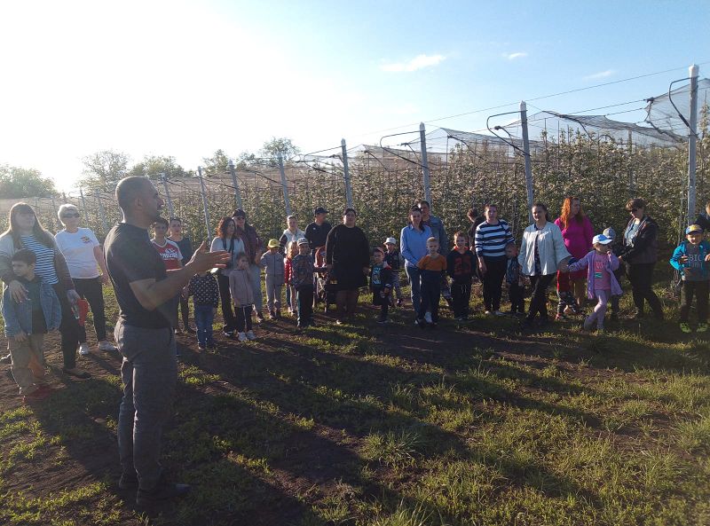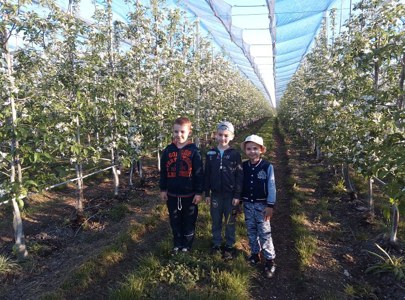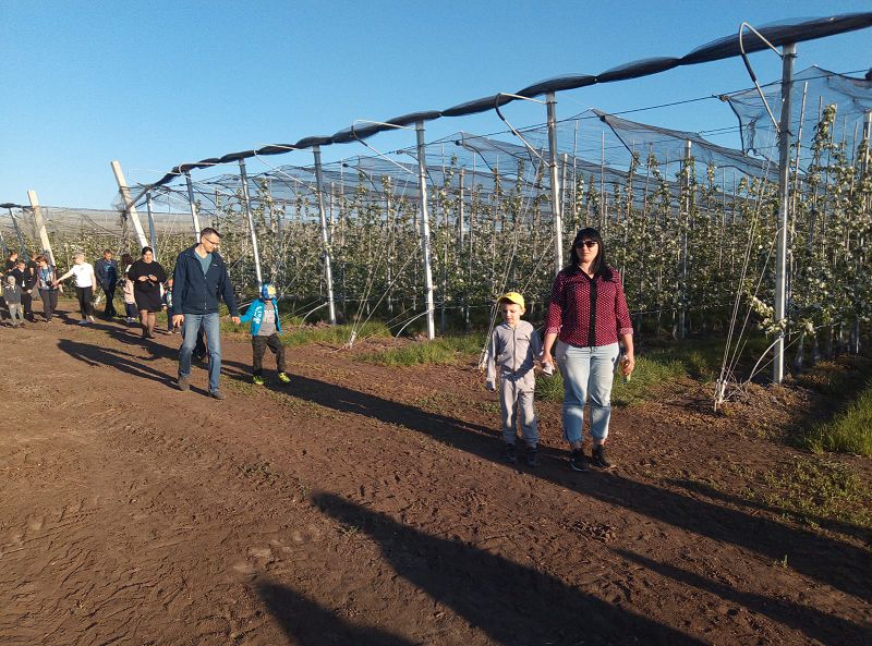 Начальник участка «Сад на орошении» - Месроп Ваганович рассказал дошкольникам, что за садом осуществляют уход садоводы, трактористы – машинисты сельскохозяйственного производства. Суперинтенсивный сад на капельном орошении расположен на площади 152,37 га. Для опыления деревьев приобретают шмелей. С помощью сетки саженцы спасают от зайцев - любителей молодой коры. Поверх деревьев натянута антиградовая сетка защищающая яблоко от града и ультрафиолета. Полив деревьев производят с помощью капельного орошения и в момент прохождения по саду дети, и родители увидели процесс работы капельного полива.