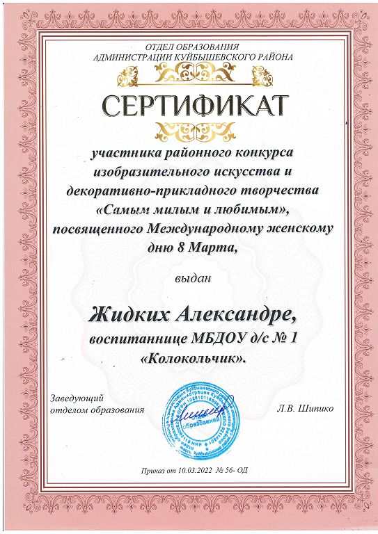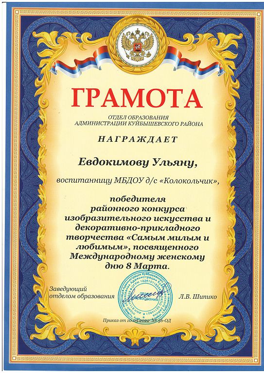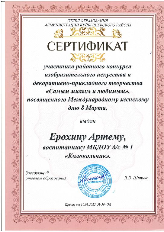 В соответствии с планом работы отдела образования Администрации Куйбышевского района на 2022 год, а также с целью развития детского изобразительного творчества и формирования у детей художественно- творческих способностей. Дети разновозрастной группы «Эколята» приняли участие в конкурсе изобразительного искусства о декаротивно- прикладного творчества «Самым милым и любимым», посвященного Международному женскому дню 8 марта. И получили грамоты победителей и сертификат участника.