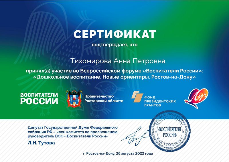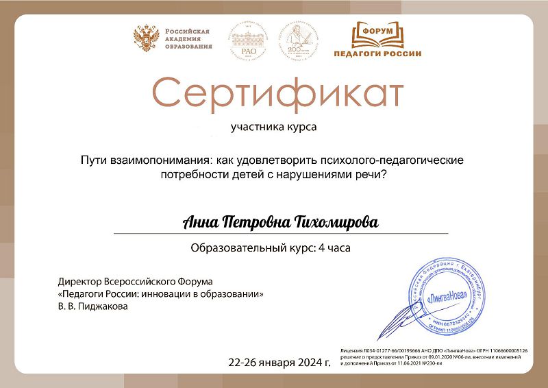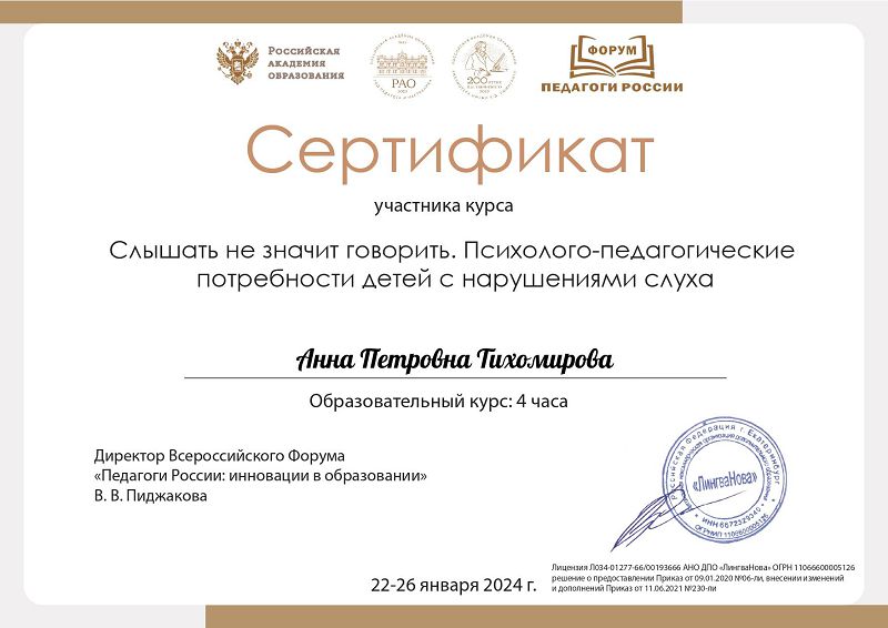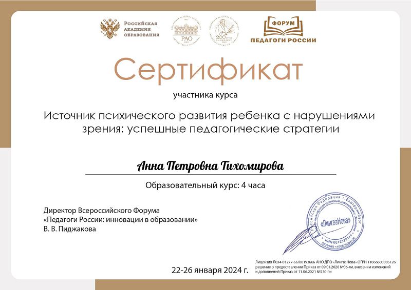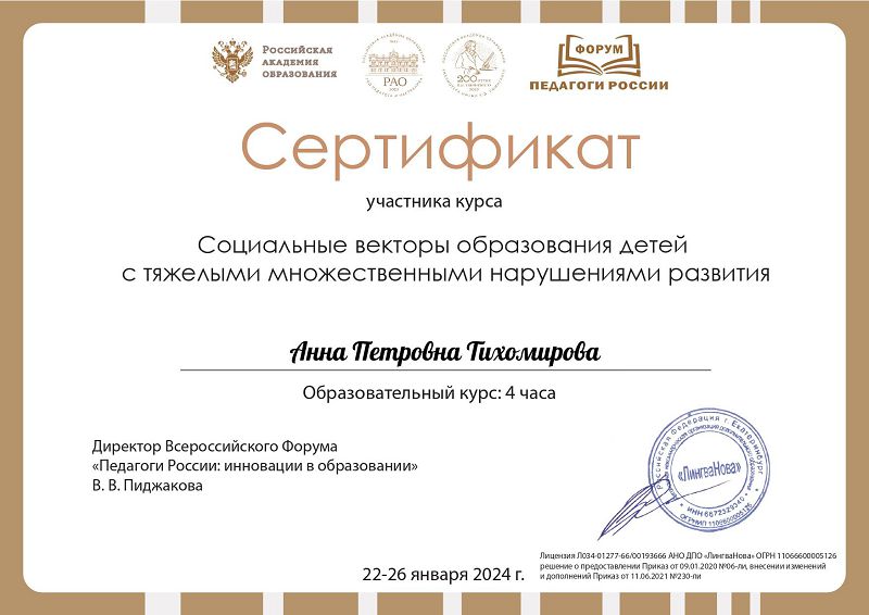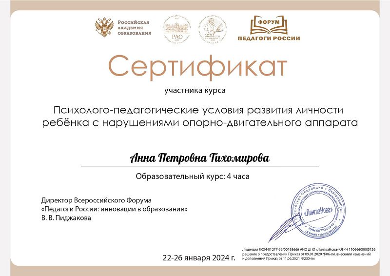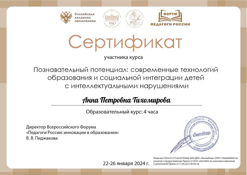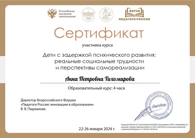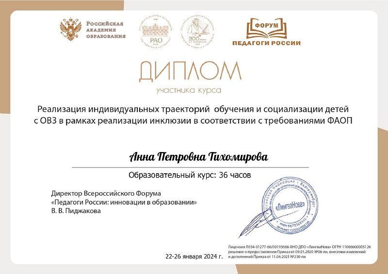 В 2023 году прошла профессиональную переподготовку по программе “Тьютор и его профессиональная деятельность в образовательных учреждениях” с присвоением квалификации “Тьютор”.