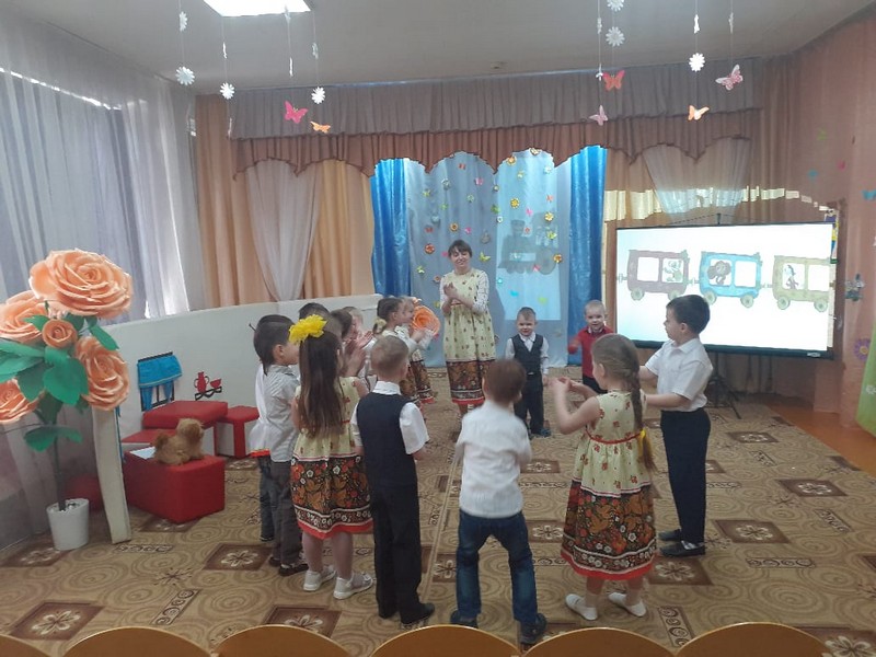 Под музыку дети, вместе с воспитателем, отправились на поезде в гости к бабушке Арине. Она познакомила детей со своими домашними животными.