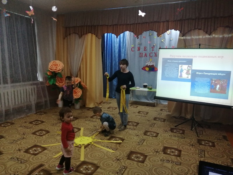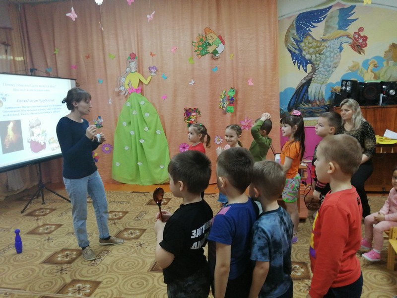 Дети очень внимательно слушали историю и традиции этого светлого праздника. Развлечение не обошлось без подвижных игр. Это замечательная возможность разучить русские народные игры. Для состязаний в быстроте и ловкости дети участвовали в эстафете с пасхальными яйцами. Они с легкостью справились с заданиями: «Пронеси яйцо в ложке», «Прокати яйцо». В течение недели воспитатели с воспитанниками читали стихи о празднике Пасхи, рассматривали картины и иллюстрации в книгах, открытки.