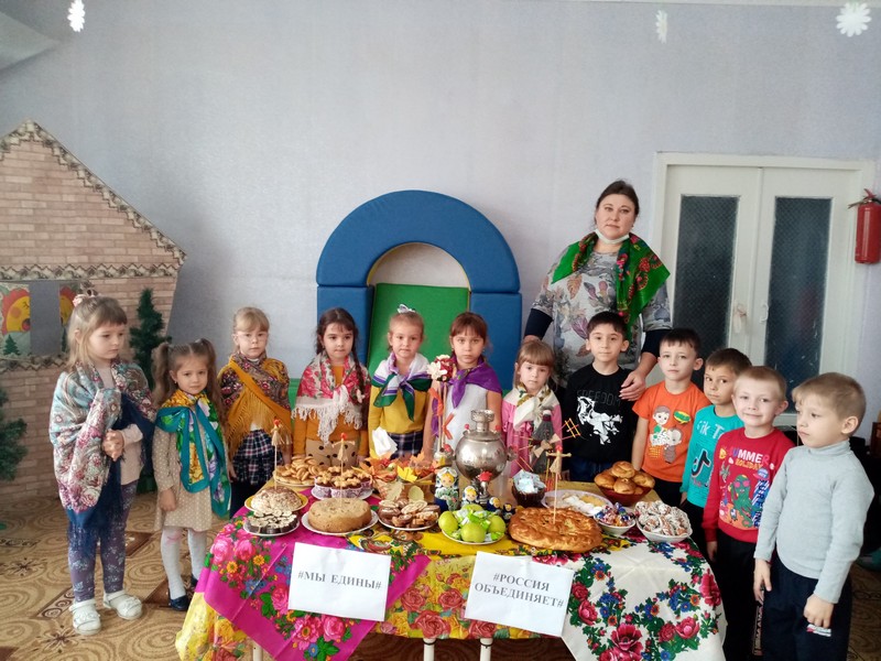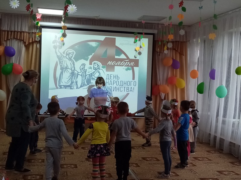 В преддверии праздника «Дня народного единства» в каждой возрастной группе МБДОУ д/с №1 « Колокольчик» с детьми проводилась непосредственно-образовательная деятельность. Детям рассказали, что на территории России живет много национальностей, со своими традициями, обычаями и народными играми. Но всех их объединяет одна единая страна —Россия. В музыкально- спортивном зале было проведено спортивно-тематическое занятие на тему: « Пока мы едины, мы непобедимы» с целью формирования знаний об истории возникновения праздника. В ходе занятия ребятам была представлена презентация о народных героях Кузьме Минине и Дмитрии Пожарском, закрепили пословицы и поговорки о Родине, а также познакомились и провели игры разных народов ( русские, армянские, украинские) Ребятам предстояло пройти множество испытаний в таких эстафетах как: «Построй крепость», «Обед бойца», «Снайперы», «Наездники», «Перетяни канат»,в ходе которых победила дружба.