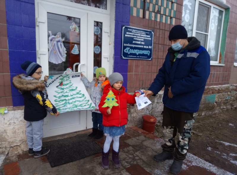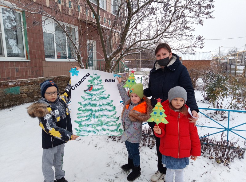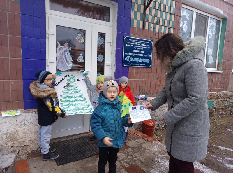 Всем известно, что Новый год - самый радостный, красивый, волшебный праздник. Обязательным атрибутом этого праздника является ёлка. Украшенная игрушками, гирляндами, мишурой, она создаёт особое праздничное настроение, дарит нам неповторимый аромат леса. Но отшумит праздник, погаснут яркие огни фейерверков и гирлянд, и сотни тысяч ёлок, ещё недавно таких красивых и нарядных, превращаются в самый обыкновенный мусор. А ведь это были молодые деревца, которые могли бы превратиться в могучих лесных великанов и оказывать благотворное влияние на окружающий мир. Для решения этой проблемы мы с ребятами задались вопросами: « Какую пользу приносит ель? Можно ли встретить Новый год без живой елочки из леса? Что мы можем сделать, чтобы сохранить зеленых красавиц в лесах нашей местности?». Дети разновозрастной группы №4 «Эколята» МБДОУ №1 д/с «Колокольчик» ежегодно принимают участие в мероприятиях проводимых в рамках Всероссийской акции «Россия-территория «Эколят –Молодых защитников Природы» и природоохранных социально-образовательных проектов «Эколята-Дошколята», «Эколята», «Молодые защитники Природы» в акции «Спасём ели». Целью данного мероприятия было: привлечь внимание детей и родителей к охране окружающей среды и бережному отношению к природе. На сегодняшний день дети и взрослые не задумываются об экологии нашей Планеты, не понимают, что, устанавливая в доме живую ель под Новый, год наносится большой урон окружающей среде. Педагоги объясняют, что искусственная ель может спасти такую же, но живую. Не остались в стороне от экологической акции и родители: дома вместе с детьми они изготовили своими руками поделки: новогодние елочки из разнообразных материалов, их фантазии не было предела - получился новогодний сказочный лес. Воспитанники МБДОУ №1 д/с «Колокольчик» раздавали поделки-елочки и призывали прохожих не губить живых красавиц.