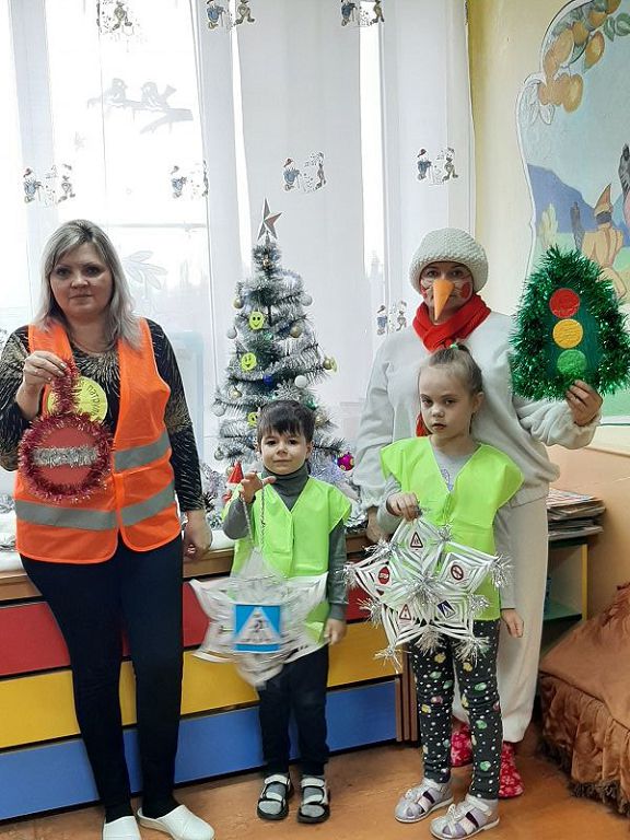 В ходе проведения мероприятия родители изготовили разнообразные фигурные снежинки со светоотражающими элементами на тематику правил дорожного движения и разместили «Снежинки безопасности» на Новогодних елках , чтобы привлечь внимание родителей к проблеме соблюдения Правила дорожного движения в зимний период. Воспитанники разновозрастной группы изготовили игрушки со светоотражающими элементами, которые так же разместили в уголках безопасности и на новогодних елках.